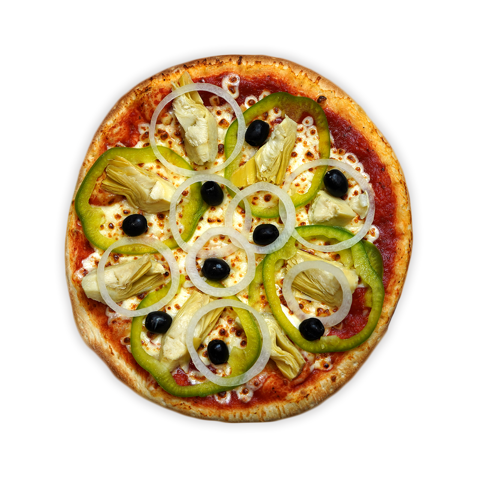 SAUCE TOMATE – MOZZARELLA – OIGNONS – POIVRONS – ARTICHAUTS – OLIVES