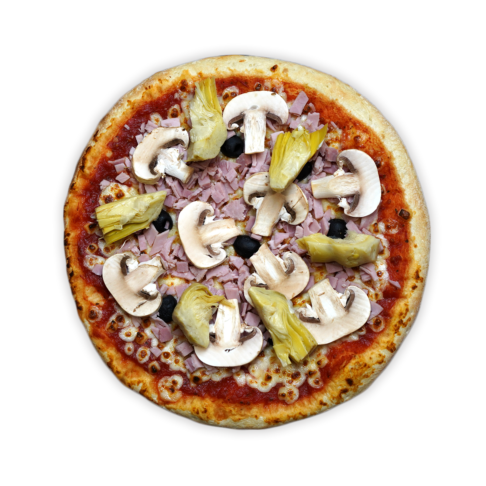 SAUCE TOMATE – MOZZARELLA – ARTICHAUT – JAMBON – CHAMPIGNONS – OLIVES